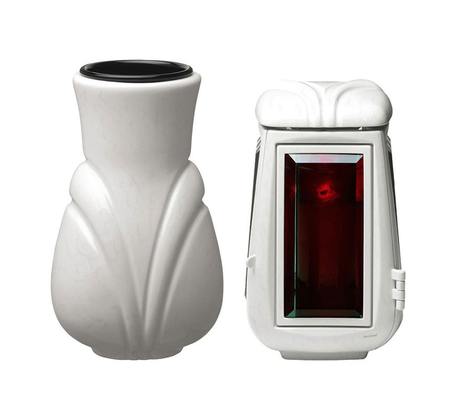 Bijela nadgrobna vaza s ugrađenim aluminijskim uloškom za cvijeće.